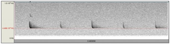 Von links nach rechts ist die Zeit aufgetragen (hier: 0,46ms, also knapp eine halbe Sekunde), von unten nach oben die Tonhöhe (von 0 bis 150 KiloHertz, Abkürzung: kHz). Man erkennt in dieser Sequenz 5 Fledermausrufe. Jeder Ruf beginnt etwa bei 75 kHz. Die Tonhöhe wird dann rasch gesenkt und bleibt am Ende kurz auf 45 kHz. Die Häckchenform der Rufabbildung und die Endfrequenz 45 kHz verraten, dass es eine Zwergfledermaus war, die hier vorgesungen hat. Insgesamt wurden in den 4 Nächten 75 Rufsequenzen aufgezeichnet:
