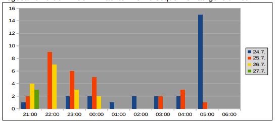In der ersten Nacht (24.7., hier blau dargestellt) ist die ganze Nacht wenig los, erst ab 5.00 Uhr am Morgen werden 15 Sequenzen aufgezeichnet. Das ist ungewöhnlich. Die nächste Nacht (orange) verläuft eher normal: Die Tiere fliegen in der Abenddämmerung, machen um Mitternacht ein Pause und jagen dann wieder in der Morgendämmerung zwischen 3.00 und 6.00 Uhr. In der dritten Nacht (gelb) fliegen die Tiere nur bis 1.00 Uhr. Ungewöhnlich auch die letzte Nacht (grün): hier wurden nur 3 Sequenzen kurz nach 21.00 Uhr aufgezeichnet, dann war die ganze Nacht Stille. Was da nur los war? Die meisten Tiere waren Zwergfledermäuse (71 Sequenzen). Ihr Ruf ist oben dargestellt und endet auf 45 kHz. Eine Sequenz stammt von einer Rauhautfledermaus. Sie ist etwas größer als die Zwergfledermaus und hat eine tiefere Stimme, ihr Ruf endet bei ca. 38 kHz: